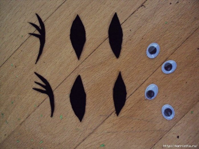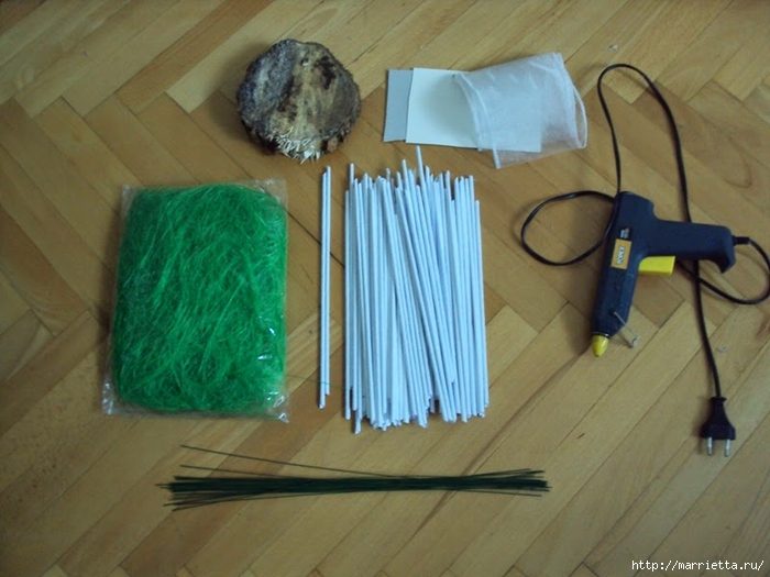 Для работы нам понадобятся трубочки из кассовой ленты, газет или журналов, белая и красная акриловая краска, лак для дерева, термопистолет с горячим клеем, сизаль зеленого цвета, проволока, кусочки черного фетра и искусственные глазки