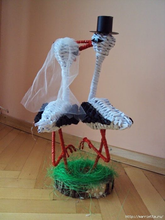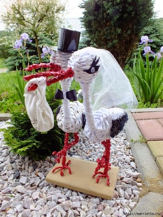 Любительницам плести из газетных или журнальных трубочек хочу предложить сплести аистов. Данную композицию можно использовать в качестве свадебного подарка или как садовую скульптуру.
