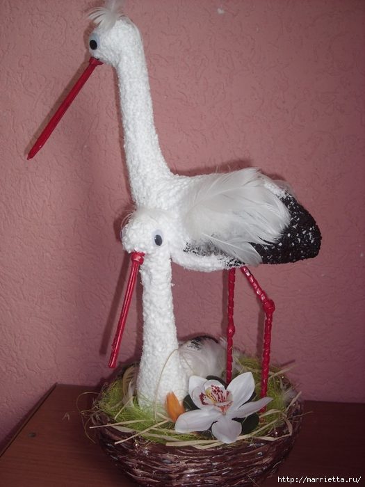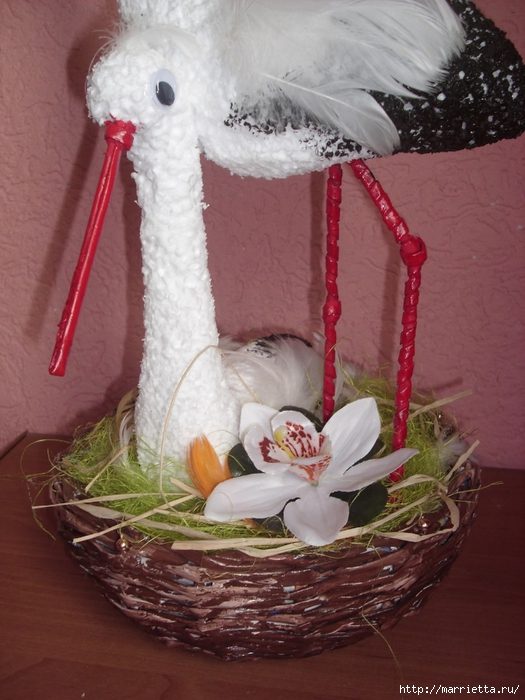 А эти аисты, ниже, вырезаны из пенопласта, у них только клювы, ножки и гнездо из газетных трубочек