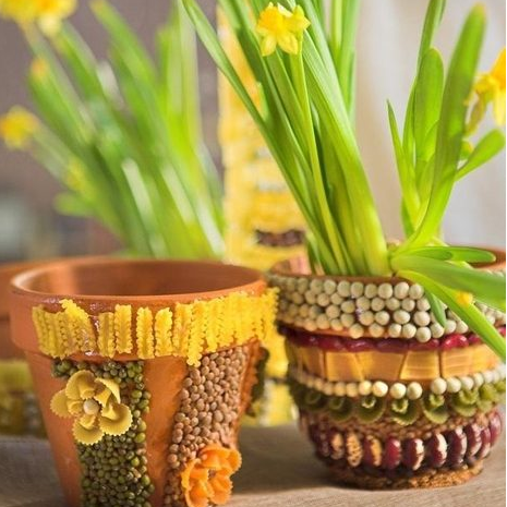Декорирование горшков макаронными изделиями, фасолью, горохом, гречкой… словом, всем, что есть в запасах на кухне. Здесь не показано, но если все это покрыть автомобильным спреем, золтым, к примеру, получится… мммм, супер!