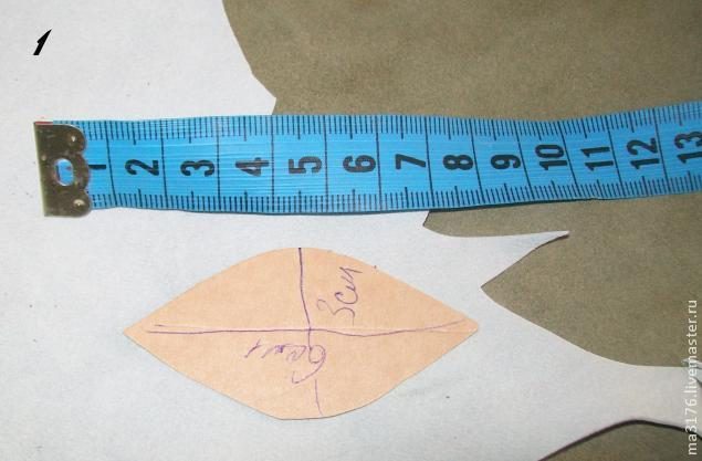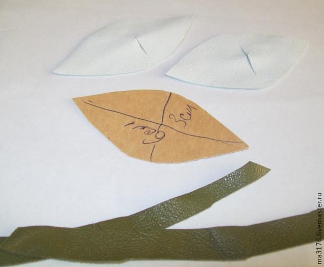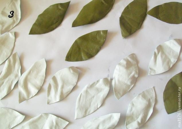 Обводим ручкой 6 лепестков на белой коже и 3 листочка на зеленой коже, вырезаем.