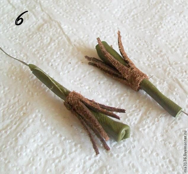 На готовый пестик приклеиваем тычинки. Для цветка в украшении можно применить готовые тычинки.