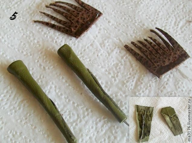 Пока подсыхают лепестки, делаем тычинки для лилии. Берем кожу потолще 1мм и вырезаем как на фото, длина по вашему желанию.