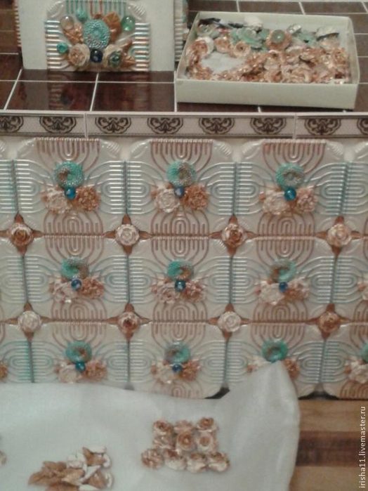 Теперь самое интересное — каждая плитка и декор к ней собираете воедино и тут ваша фантазия безгранична, все крепится на монтажный клей при помощи пистолета и рук.