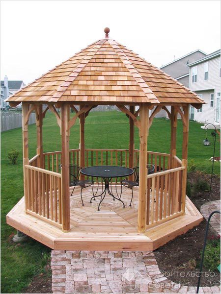 При использовании дерева обязательно обработайте ее защитными составами, это позволит защитить древесину от атмосферных и других воздействий, тем самым сохранить внешний вид беседки и продлить срок ее службы.