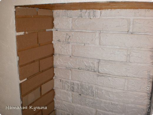 С помощью жидких гвоздей приклеила потолочный плинтус. на верх камина, там где станина. На фото видно, как последний лист картона закроет станину.