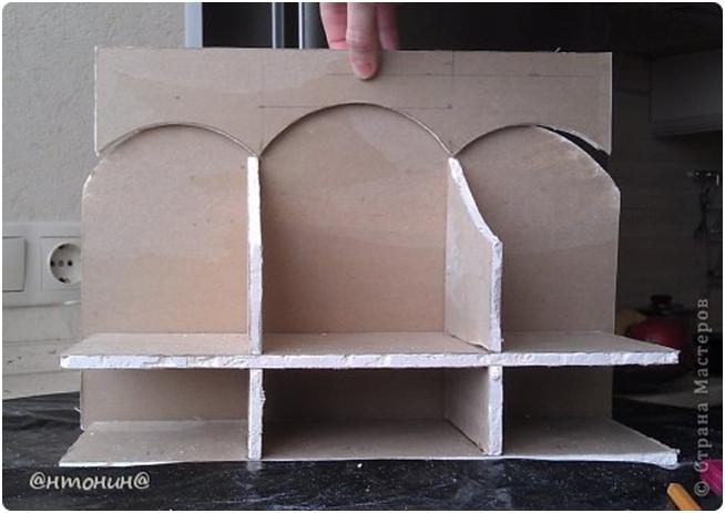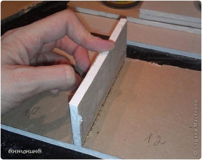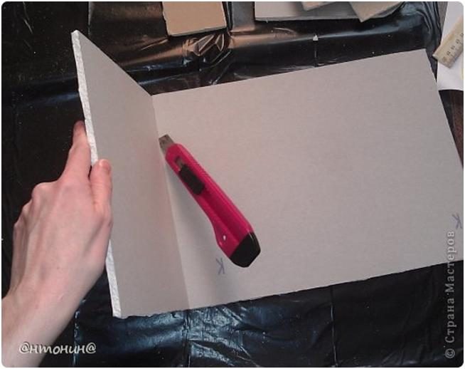 Чертим разметку дна и полочки. Девочки размеры не указываю, потому как я делала под размер своей полки, а у Вас они могут быть другими. Делаем разрезы ножом. Разрез нужно делать с нажимом такой силы, что бы разрезать верхний слой картона и немного прорезать гипс.