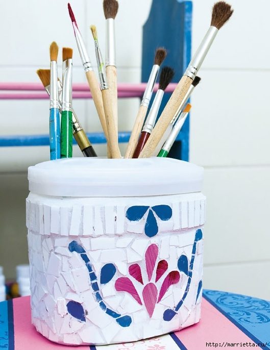 Приклеиваем мозаику к ведерку