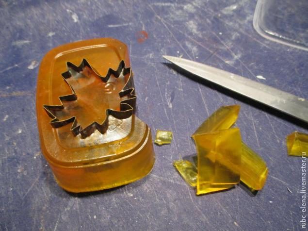 3) Вырезаем листик. Т.к. формочка меньше, чем толщина куска мыла, то помогаем ножом, прорезая до конца.