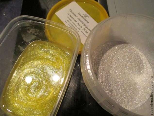 4) Растапливаем еще немного основы, добавляем в неё желтый краситель (но немного меньше, чем в прошлый раз) и перламутр, а так же ароматизатор. Даем застыть.