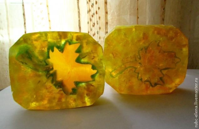 Нам понадобится: мыльная основа прозрачная (у меня SLS free Англия, но можно и другую), желтый краситель, лучше даже мигрирующий, т.к. он не замутнеет и остается прозрачным (у меня пищевой), формочка прямоугольная, формочка в виде кленового листика (она самодельная, можно сделать такую же самим или купить нечто подобное), базовое масло (у меня масло зародышей пшеницы, но можно любое), перламутры двух цветов: у меня «алмазная пыль» и «зеленое яблоко», ароматизатор любой (у меня «HUGO BOSS», т.к. мыло собирались дарить мужчине). И как обычно: емкость для СВЧ для основы, палочки для размешивания, пипетки для ароматизатора, нож и конечно же хорошее настроение!