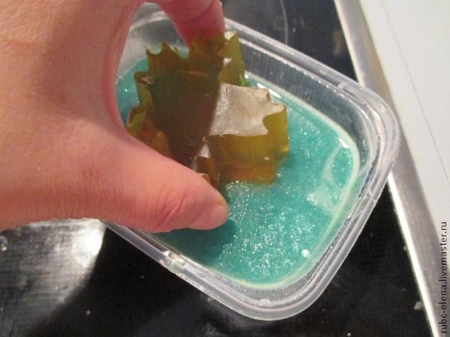 5) Пока наша основа застывает, мы растапливаем еще основу и добавляем зеленый перламутр. И пока он не остыл окунаем туда наш листик. Надо обмакнуть с разных сторон так, чтобы он был равномерно (по возможности) окутан зеленым слоем.