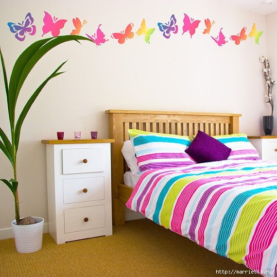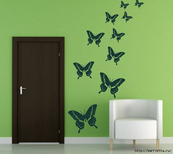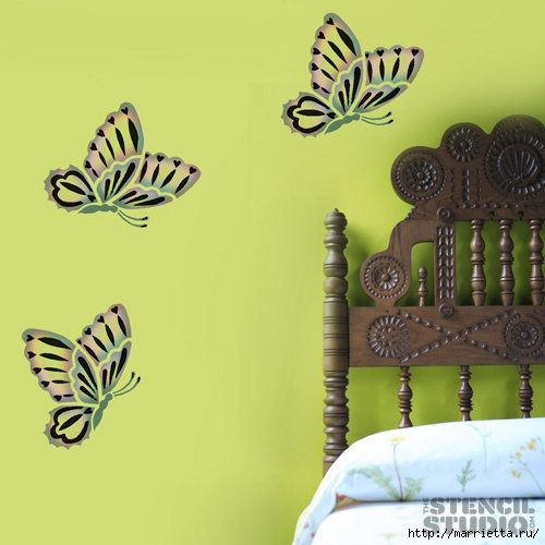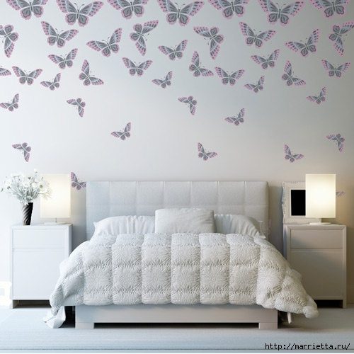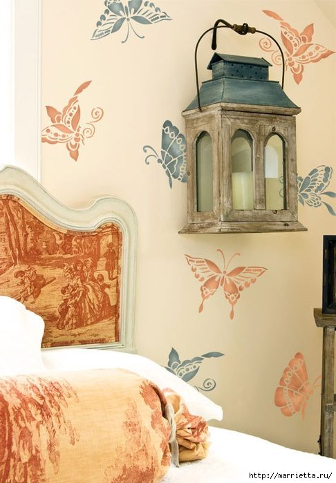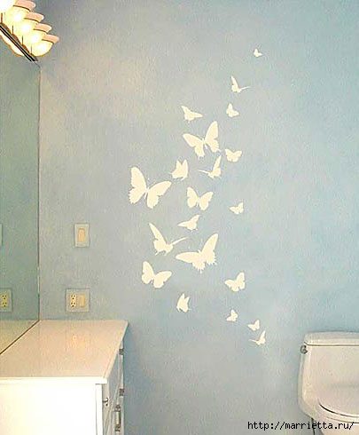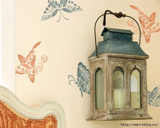 С помощью трафаретов на стенах или на потолке можно нарисовать порхающих бабочек. Согласно философии фен-шуй бабочки считаются символом легкости в отношениях, символом радости и искренней любви.