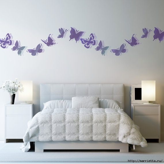 В интерьере, на стенах или потолке, бабочки размещаются парами или небольшими стайками. Все должно выглядеть максимально естественно, будто они сами впорхнули в спальню через дверь или через окно, после чего начали кружить вокруг кровати и под потолком. Когда вы будете утром открывать глаза, радостные порхающие бабочки будут встречать ваше пробуждение, вне зависимости от погоды за окном. А ночью, засыпая в своей удобной кровати, вас будут переполнять приятные чувства и эмоции.