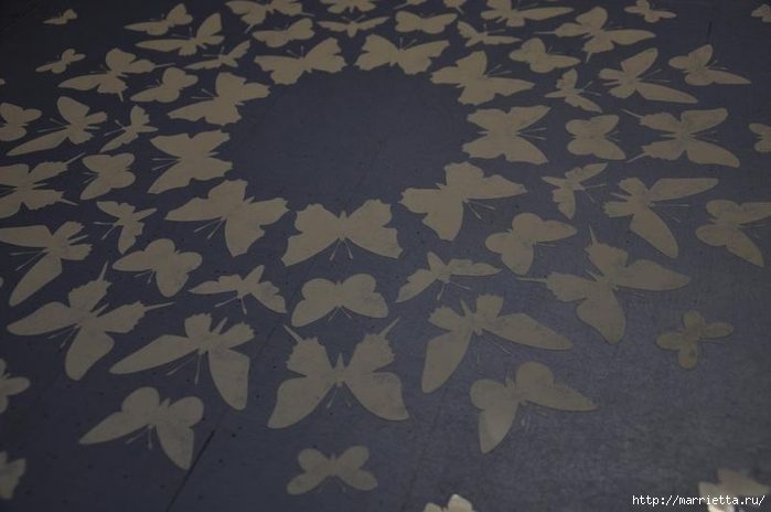 В данном варианте бабочки размещены в спальне, на потолке, вокруг люстры. Нарисованы они с использованием трафаретов акриловой краской. Разместив бабочек в спальне вы сможете при одиночестве наладить свою личную жизнь, возродить пламя страсти при наличии процветающих отношений.