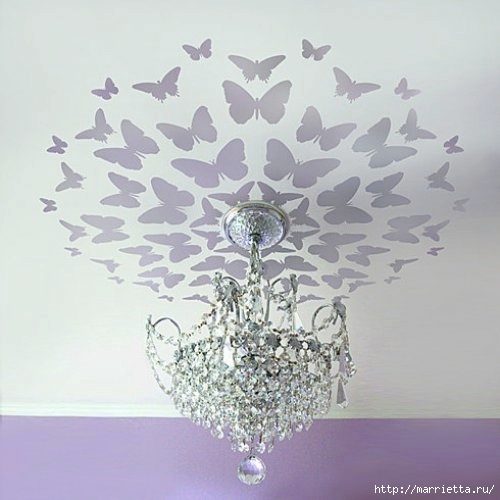 Бабочка символизирует воскресение, возрождение и бессмертие души. Она может превращаться, трансформироваться, преображаться из обычной гусеницы в прекрасное небесное создание, появляясь на свет в абсолютно новом обличии. Для нанесения рисунков на потолок или стены дома используются трафареты (не все умеют рисовать), трафареты можно приобрести в интернет-магазинах, но не стоит покупать то, что можно легко сделать своими руками. Достаточно иметь дома принтер, бабочка распечатывается и аккуратно вырезается, прикрепляется к сене или потолку при помощи скотча и все), остается только подобрать цвет акриловой краски, в соответствии с оттенками вашего интерьера.