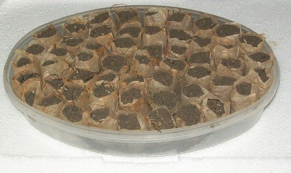 Подготовку пакетиков можно делать в любое время, длинными зимними вечерами, когда у садоводов обычно времени предостаточно. В каждый пакетик можно сразу вложить семечко (или их парочку, потом более слабое удалить) выращиваемой культуры. Сколько подготовлено «заряженных» пакетиков, надо установить в какую-либо емкость с невысокими бортиками. В промежутки между пакетиками тоже надоприсыпать землю, чтобы в будущем влага из пакетиков испарялась меньше (вследствие уменьшения площади испарения).