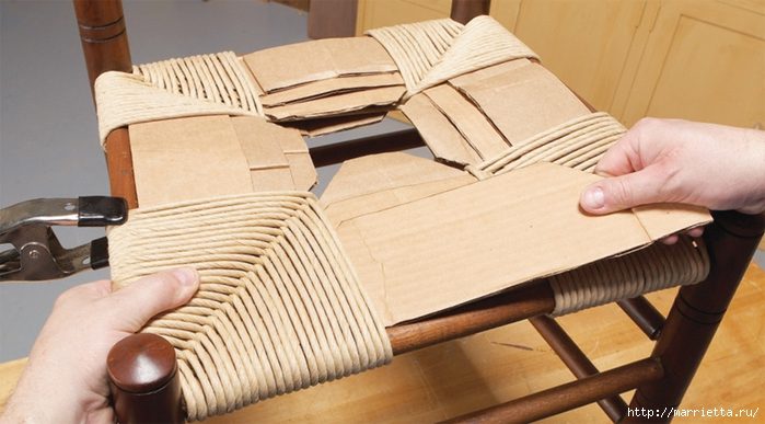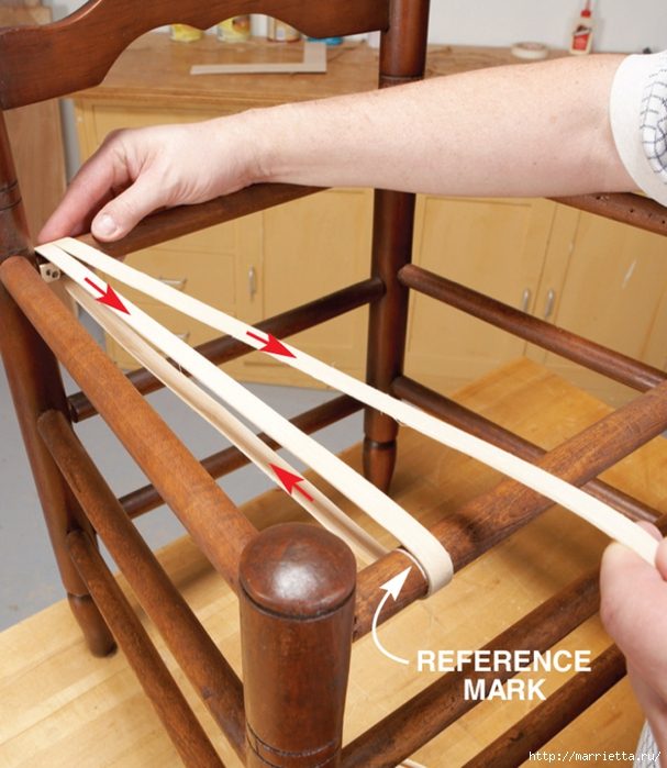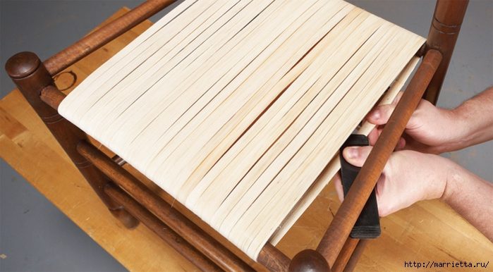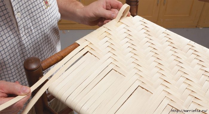 А сейчас предлагаю просмотреть фото мастер-класса по реставрации стульев с плетеными сиденьями с использованием деревянного шпона и бумажной рафии