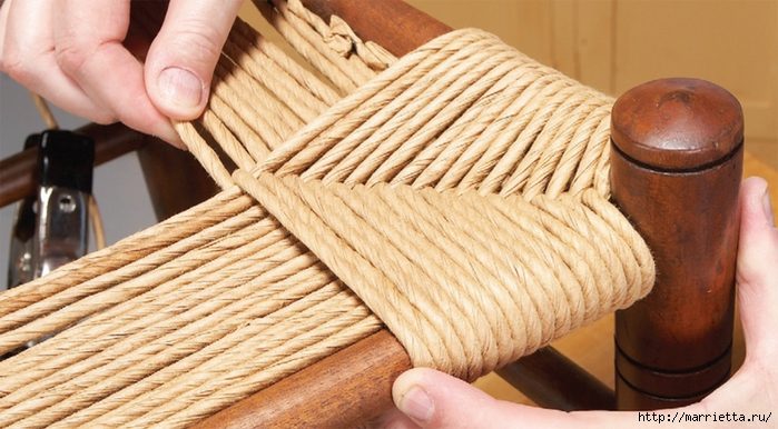 Для изготовления или реставрации плетеных сидений и спинок используют капроновые полоски, которые хорошо имитируют ротанговую соломку. Для имитации ротанговой соломки можно также использовать капроновую леску, которую применяют в теннисных ракетках. Чтобы она стала плоской, ее проглаживают через бумагу горячим утюгом. При желании она может быть подкрашена в любой цвет. Кстати, для реставрации можно также использовать трубочки из газет, из которых мы плетем корзинки). В магазинах для реставрации стульев можно приобрести деревянный шпон, бумажную рафию, леску, бельевую веревку… подойдет все, кроме шпал и рельсов))).