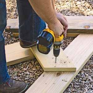 пила, дрель и шуруповерт, а также верстак, рулетка и карандаш