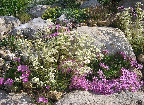 Это не дань моде и не влияние красивых журналов. Мне всегда нравилось сочетание камня и ярко цветущих «ковриков» и «подушек». C самого начала закладки сада я собирала коллекцию горных растений. Сначала это были самые распространенные и простые в культуре альпийцы: гвоздика травянка, арабис кавказский, ясколка войлочная, различные очитки и молодила. С годами интерес к горным растениям только рос, и небольшая горка уже была не в состоянии вместить все камнеломки, гвоздички, колокольчики, крупки, молодила. Появились более редкие и капризные растения, требующие особых условий. Мы решили заложить новый альпинарий. Выбрали место в конце между баней и сараем. Этот участок земли никак не удавалось рационально использовать. Почва там очень бедная, место сильно продувалось ветром, весной очень рано сходил, а осенью наоборот, поздно ложился снег. Такие условия могут выдержать только горные растения, они приспособлены к суровому климату.