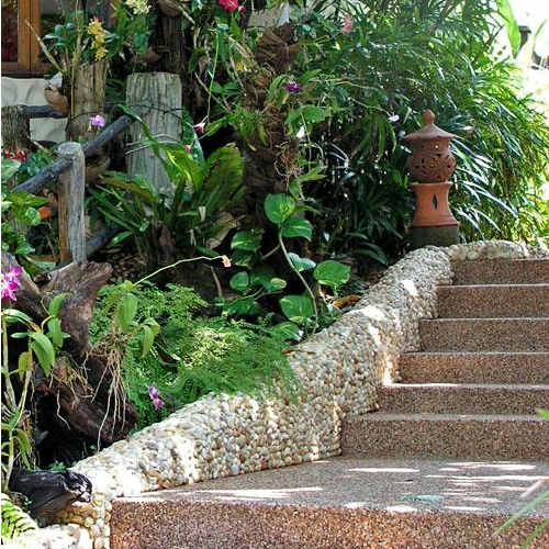 Один из вариантов – выполнение мощения из нее или декор галькой ограждений.