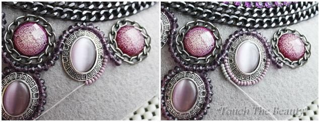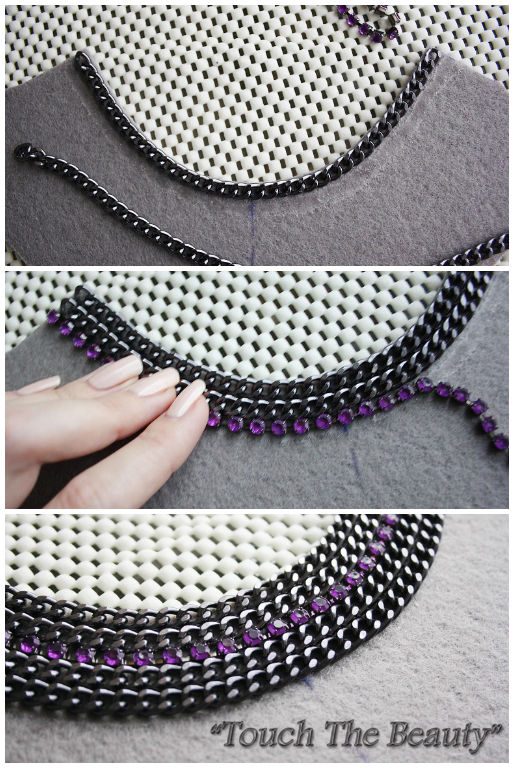 Приклеив аккуратно все ряды, обязательно нужно закрепить все это дело стежками (я привыкла делать качественно и «на долго», поэтому не позволяю себе в украшениях «просто приклеить» что-то), закрепляем через каждое звено цепочки стежком.