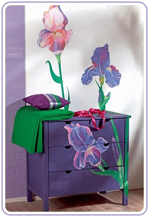 4. Основным элементом, который используется, чтобы выполнить декупаж комода, является наклейка произвольной формы, размер которой, как и форму, вы можете подобрать на своё усмотрение. Наклейку снимают с подложки и наклеивают на комод в нужной последовательности.
