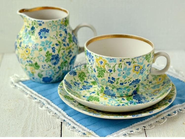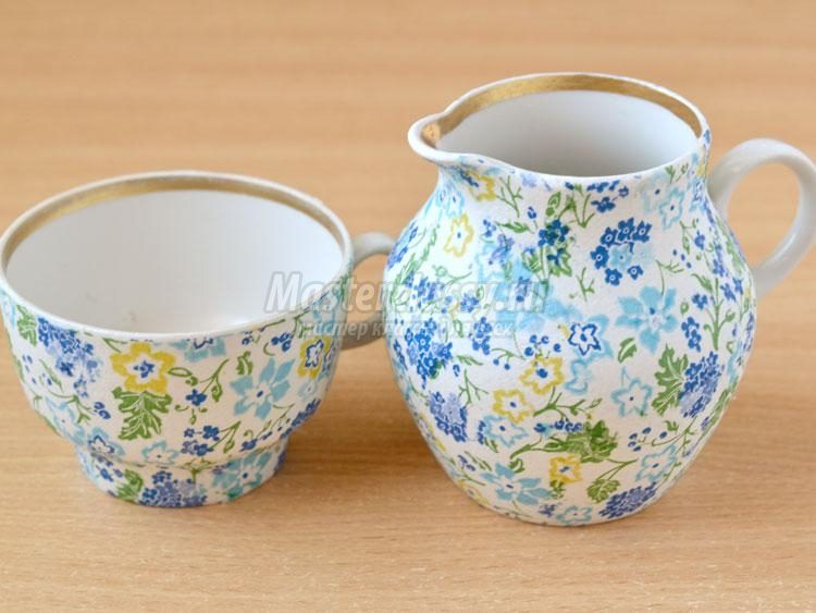 На чашку, блюдце и молочник салфетку наклеиваем оборванными кусочками, так поверхность получится более ровной. Чтобы наклеить, накладываем фрагмент салфетки на посуду и промазываем сверху разведенным 1:1 с водой клеем ПВА, стараясь, чтобы не закладывались складочки и выгоняя воздух.