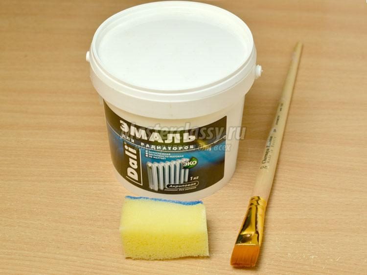 Для первого шага нам понадобится грунтовка. Хорошо для этих целей подходит белая акриловая краска для радиаторов. Она водостойкая, имеет хорошую степень адгезии (сцепляемости материалов), поэтому для покрытия фарфоровых или фаянсовых поверхностей очень удобна.