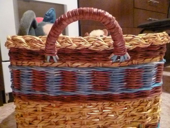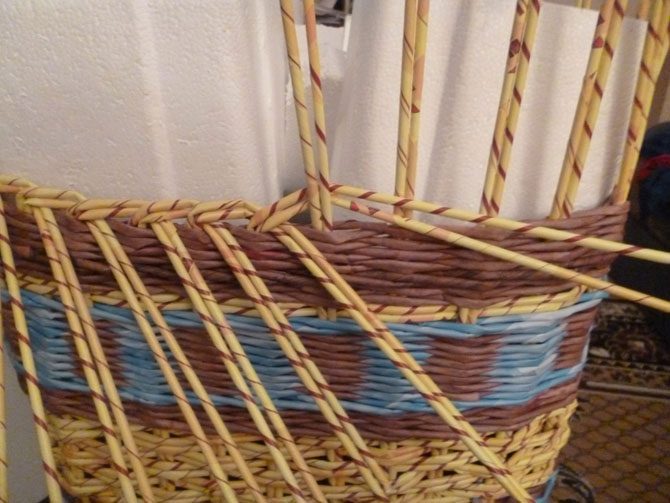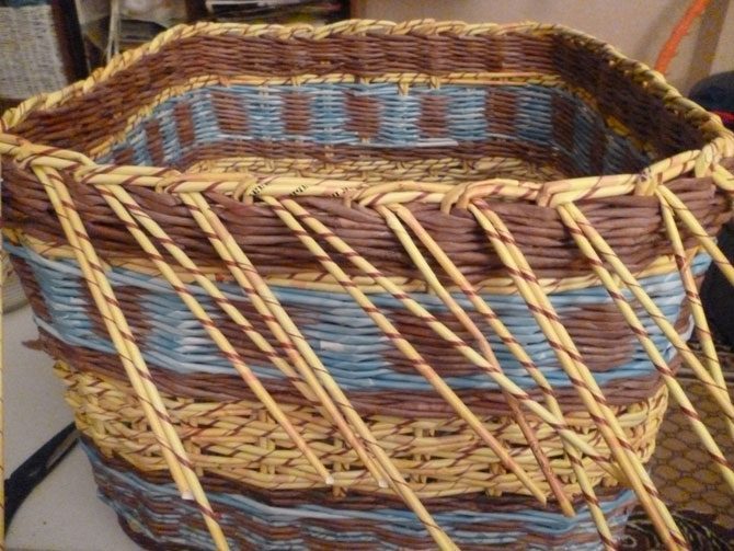 Сначала сплела дно, шириной 40 см. Потом подняла стенки, используя узоры «верёвочка из двух трубочек» и «ситцевое плетение». Заметила, что «ситцевым» плести гораздо быстрее.