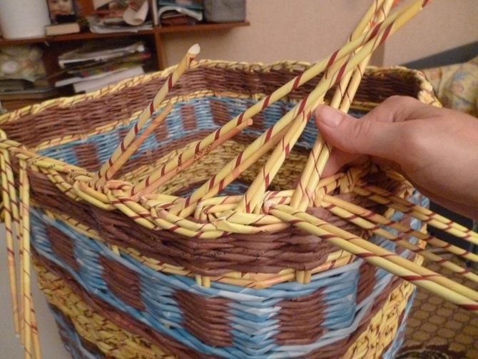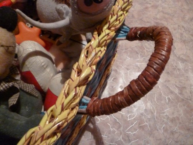 Далее прикрепила ручки по бокам. Для того, чтобы ручки были прочнее и прослужили дольше, внутрь каждой трубочки просунула проволоку, которую достала из старого сгоревшего шнура для ноутбука.
