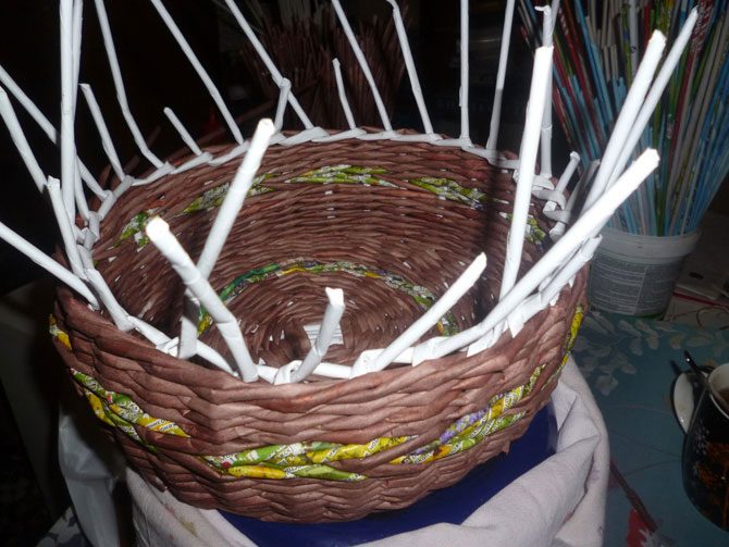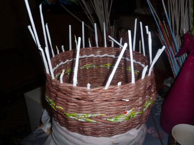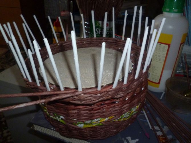 На этот раз получилась шкатулка для рукоделия. Использовала трубочки из газетной бумаги, крашеные морилкой цвета «Мокко», а также из рекламных журналов получились зелёненькие заготовки.