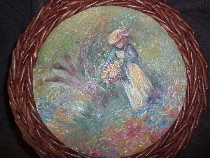 Для крышки я вырезала круг из обоев, мотив с девицей. Крышка получилась высотой 3 см. Стоечки просто обрезала.