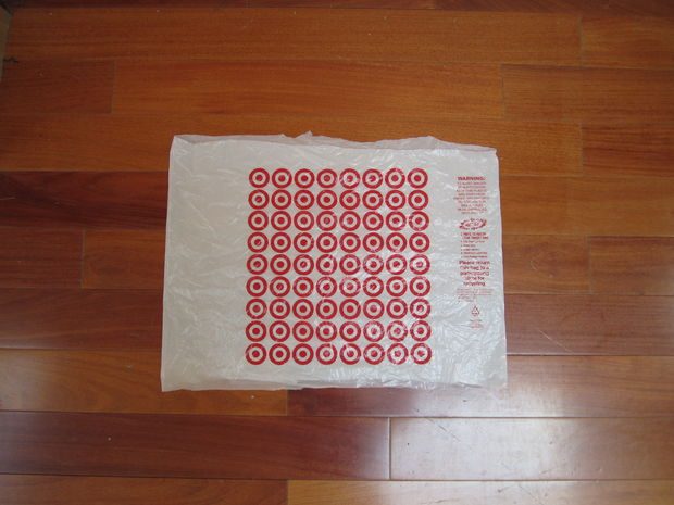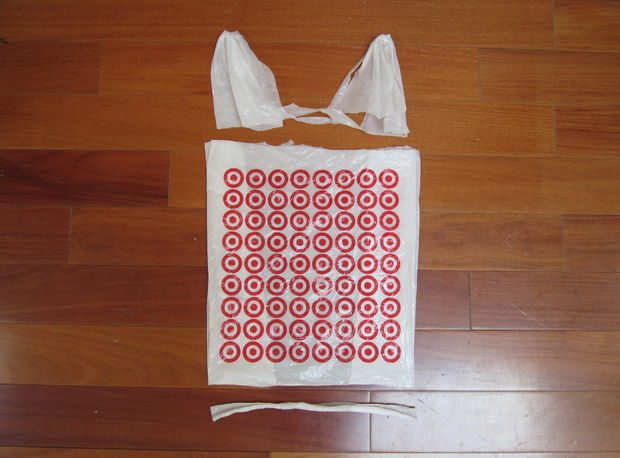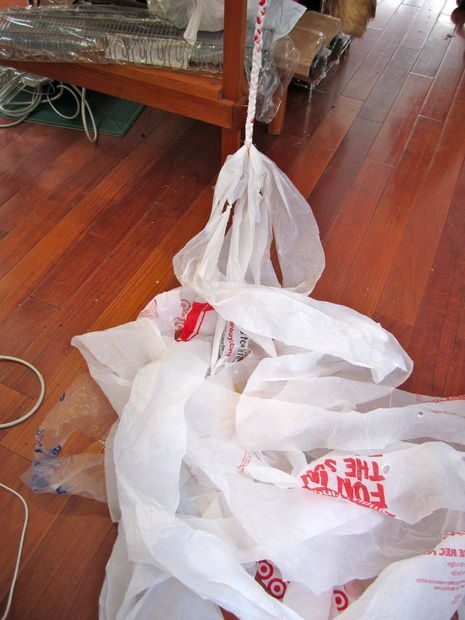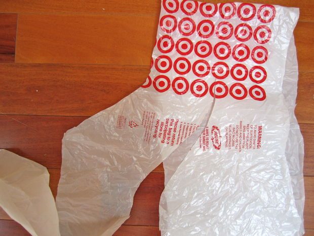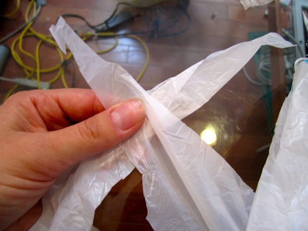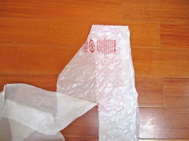 Подготавливаем «пряжу». Для этого необходимо нарезать пакет на полоски приблизительно 4-х см шириной, предварительно обрезав ручки и днище у пакета. Обратите внимание, автор нарезает полоски по косой для того, чтобы из одного пакета получить только одну полосу.