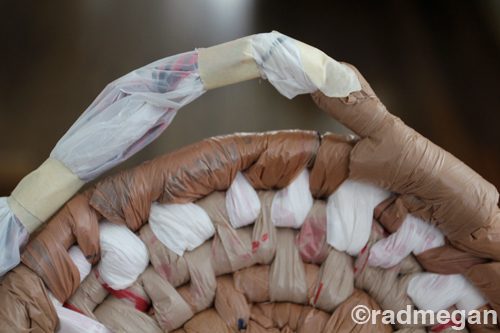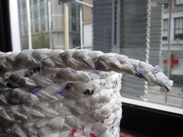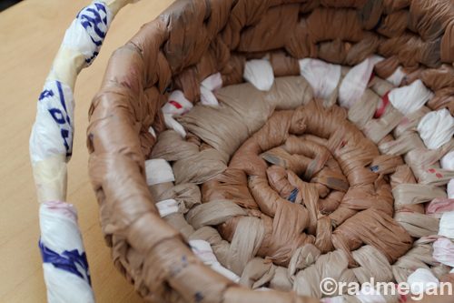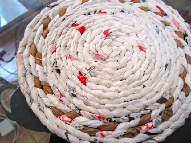 Логика этой работы следующая. Из пакетов формируют скрученную нить, она будет формировать как бы остов корзинки. И полиэтиленовой нитью с помощью иглы полученный остов прошивается. Подробнее смотрите на фото, по-моему, вполне понятно.