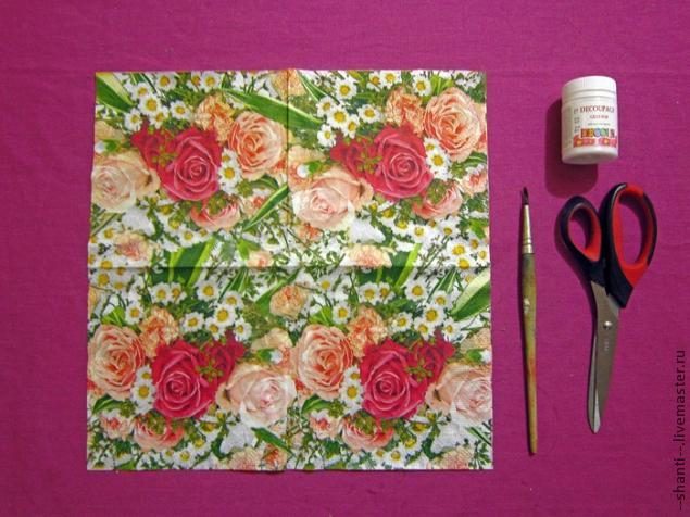 2. Мне понадобилось: клей для декупажа, кисточка, ножницы, 1 салфетка и лак для закрепления