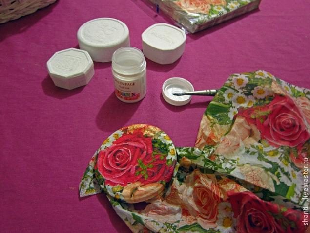 4. Выбираем, какую часть узора хотим нанести, и прикладываем к салфетке верх дном. Аккуратно прижимаем верх крышки. Чтобы лучше приклеить края — я перевернула на бок и просто покатала крышку по столу: