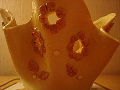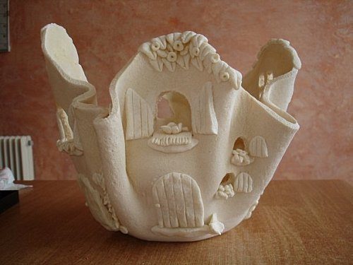 Подсушиваем в духовке в течении часа при температуре 60 градусов, затем конструкцию переворачиваем и снова на час отправляем в духовку. Даем остыть и осторожно снимаем тесто с банки. Вырезаем из оставшегося теста мелкие детали, которые приклеиваем к чаше на ПВА. Снова помещаем в духовку и окончательно высушиваем сначала на малом нагреве, а потом его постепенно увеличиваем. Оптимальная температура от 80 до 100 градусов. После полного высыхания можно покрасить тесто гуашью или акриловыми красками и покрыть акриловым лаком на несколько слоев.