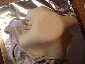 Теперь приподнимаем ткань вместе с тестом и помещаем конструкцию на стеклянную банку. Банка уже должна стоять на противне, покрытом фольгой или бумагой для выпечки. Придаем тесту форму чаши и при необходимости формируем в ней задуманные отверстия.