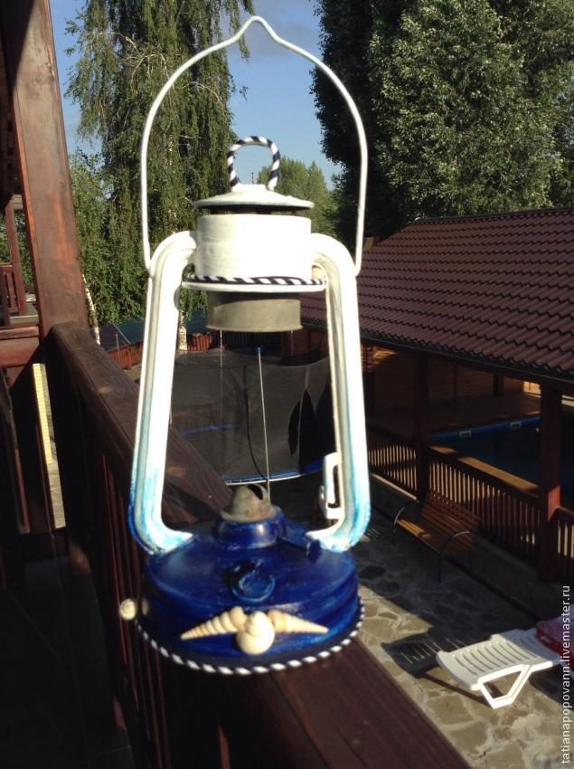 Приступаем к покраске. Так как это у нас яхт-клуб, лампа будет в морском стиле. На низ лампы наносим 2-3 слоя синей краски, обязательно просушивая каждый. Верх у нас будет белый, соответственно берем краску данного цвета и так же наносим 2-3 слоя. Лампа будет использоваться по назначению, поэтому место фитиля не трогаем и при покраске следим, чтобы все детальки оставались подвижные.