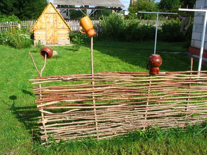 Наверное, самый интересный и простой способ изготовления изгороди своими руками считается плетеный забор. Хотя он и не требует больших финансовых затрат, но учтите, что на больших объемах, это очень трудоемкий процесс.