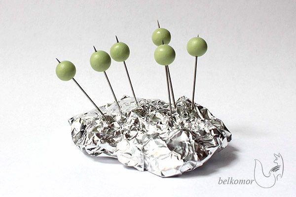 После того, как шарики немного полежали и затвердели, я сделала в них отверстия иглами и воткнула бусины в смятую фольгу. Пора запекать!
