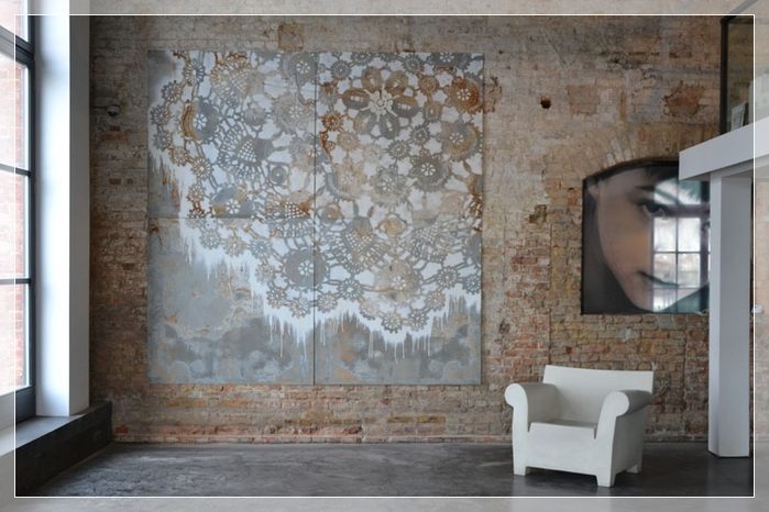 Желательно, чтобы цвет поверхности и цвет наносимой краски имели контрастные оттенки, например: серый и белый, бордовый и горячий желтый, синий и белый. Для нанесения кружевного рисунка можно использовать не только кружево, но и старые занавески, гипюр, вязаные салфетки.