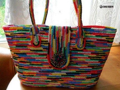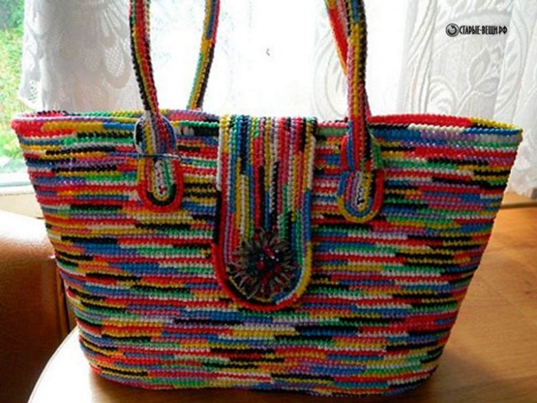 Я тоже делала так, пока не увидела в интернете вязаную сумку из полиэтиленовых пакетов. Никакой вычурности и лишних деталей и, вместе с тем, яркая, оригинальная, смотрится великолепно. Вяжется крючком. И если у вас есть хоть небольшой опыт вязания крючком, вы без труда справитесь с этой работой и получите взамен стильную удобную сумку. Надо только подобрать пакеты поярче разных цветов и сделать из них пряжу.