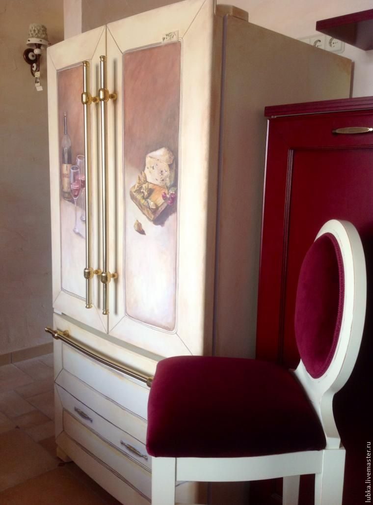 Нам предстояло расписать большой красивый холодильник, цвет которого совершенно не подходил к мебели. Стены в кухне были светло-кремовые, слегка состаренные, фасады кухни насыщенного вишневого цвета в комбинации с цветом слоновой кости.