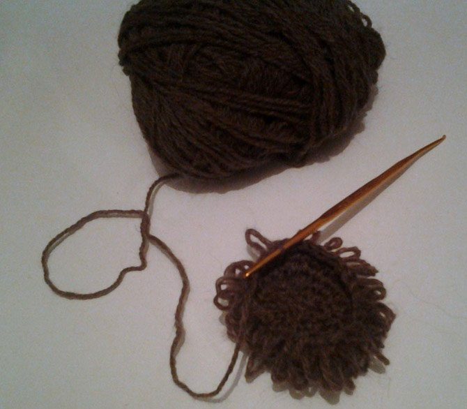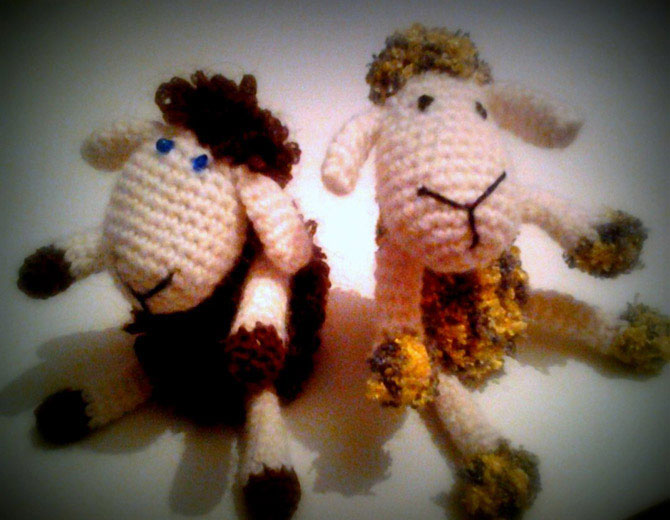 Первый барашек получился кудрявым, туловище я ему связала коричневой пряжей, узором, как для мочалок, с петлями. Также он получил пышную причёску!