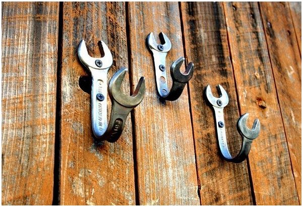 Ваши гаечные ключи могут легко стать удобными крючками для гаража или домашнего офиса. Это больше по мужски, и немного творчески.