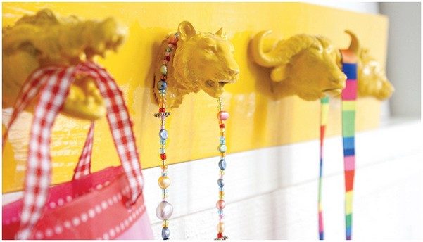 Идеально подходит для игровой комнате или прихожей. Возьмите дешевых пластиковых животных, покрасьте их в один цвет используя краску-спрей красить, и разместите на стене. Вешалки будут достаточно крепкими, чтобы можно было повесить почти все, и это определенно эклектичный выбор.