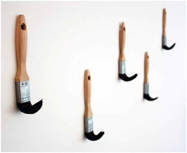 Для придания интерьеру немного художественной сути, возьмите кисти и превратите их в крючки! Для этого Вам нужно будет сделать кисть твердой, и приклейте их в искривленном виде. Это отличный способ для отображения произведений искусства в домашнем офисе!